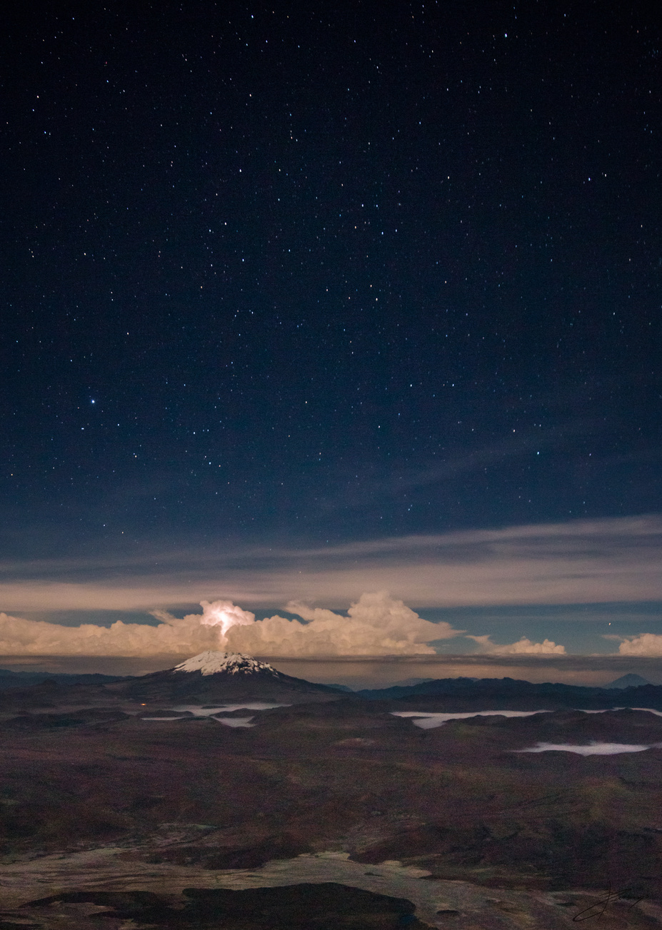 Tormenta eléctrica sobre el volcán Antisana visto desde la cumbre del